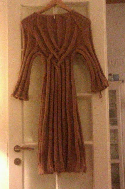 Kjolen har fået forlænget ærmerne med ca 8 cm, of det hjalp på proportionerne. Nu skal der hæftes ender, halskanten skal sys og kjolen skal dampes. Den bliver klar til nytårsaften :)
